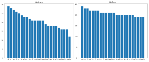 So now’s the interesting part. Instead of looking at how it’s done, I started thinking… How would I solve this? So I came up with a simple algorithm where we have an initial set of features \mathbf{f} = [f_1, f_2, f_3, \ldots, f_N] If we randomly select \sqrt{N} for each tree, we get a non-uniform distribution of features along the trees, which means some of them (maybe crucial ones) will be underrepresented. So it looks like the distribution of features should be uniform – each feature should be used approximately the same number of times among the forest. This would not only reduce the risk of underrepresenting crucial features but also would make trees more diverse, which is very desired in a random forest.